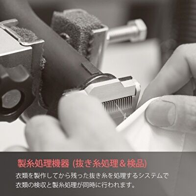 縫製時の処理と検品が同時に行われ、ほつれや糸くず等がないかもしっかりチェックします。