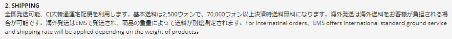 | 配送料 | 70000ウォン以上で無料(未満2500ウォン)/海外発送:重量制による |